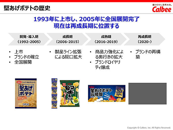 1993年の発売当初、通常のポテトチップスとの差別化に手応えはあっても、実際の売上は期待ほどには上がらなかった。そこで商品名を変えたり、辛い味にしたり、油分が少ないというヘルシーさを訴求したりと、模索した時期もあったという。しかし、改めて原点に戻り、「堅めの食感」「噛み締めて味わえるじゃがいもの味」の2大特徴を打ち出すことを決意。それが「噛むほど、うまい。」という“プライマリーベネフィット”の訴求へとつながった。