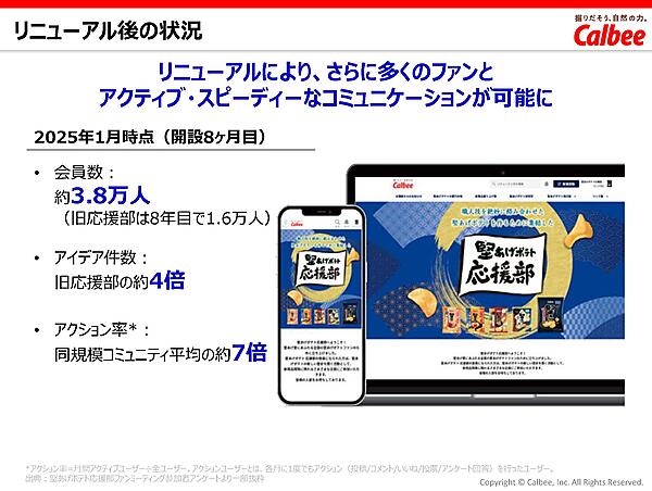 当初の目的は、ファンの声を活かした共創商品の開発と、限定コンテンツやファン同士の交流を通じたブランドロイヤルティの向上にあった。そして「堅あげポテト応援部」開設から8年後、X(旧Twitter)のAPI仕様変更などの外的要因や、登録数の横ばい、施策への参加率低下といった内的要因を踏まえ、2024年にリニューアルを実施。カルビーの全製品のファンコミュニティアプリ「カルビールビープログラム」に移管された。