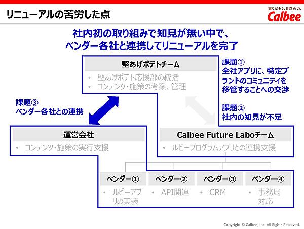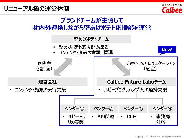 運営については、リニューアル前には穂積氏が属する「堅あげポテトチーム」が統括役としてコンテンツ施策の考案・管理を担い、外部の運営会社が実際のコンテンツ作成などの実行施策を担当していたが、アプリとなって技術的なサポートが必要になったことで「カルビーFuture Labチーム」が参画。