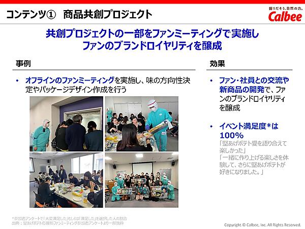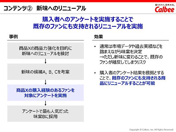 しかし、穂積氏は「過去の実績や市場データは客観的とはいえ、顧客ニーズの細かい粒度までは把握できず、逆にSNSでは解像度は高いものの、本当に商品を買ってくれたユーザーなのか信頼性にはやや難がある」と語る。そうした弱点をカバーするものとして、カルビーでは「ファンコミュニティ」を商品開発に活用しているという。