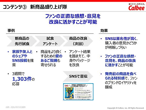 ファンの正直な感想・意見を改良に活かすことを目的とし、新商品の先行試食を実施。抽選で発売前の商品を送り、家族や友人とシェアしつつ感想や意見を提出してもらう。3週間で1,303件もの応募があった。発売前の商品を食べられるという特別感は、ブランドロイヤルティを醸成することにもつながることは間違いない。