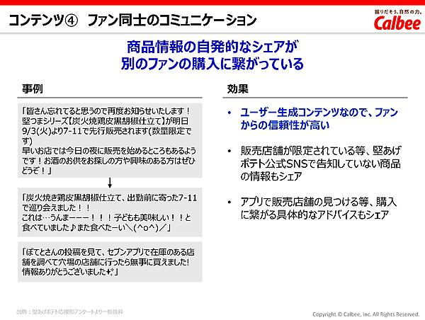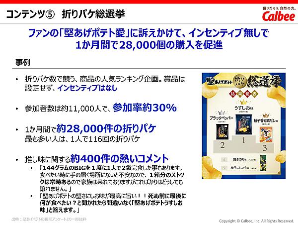 こうした「堅あげポテト応援部」の取り組みから、購入実績のある“真のファン”との関係構築によって、SNSなどの匿名性の高い場での意見収集だけでなく、実際の購買データと紐づいたコミュニケーションが可能となり、より信頼性の高い商品開発へとつながった。また、キャンペーンを起点として、オフライン・オンラインの両方でファン同士の交流を促進することで、より深い絆を築き、それがブランドロイヤルティの醸成にも寄与した。