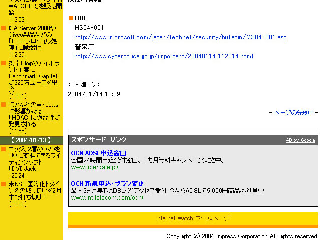 出典:Internet Watch「Google、サイト向け広告配信プログラム「AdSense」の日本提供を公式発表」(2004年1月14日付け)