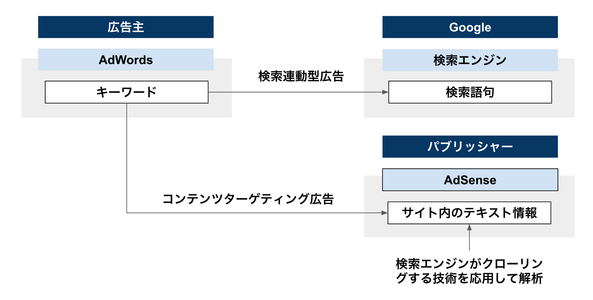 コンテンツターゲティング: 「広告主が登録したキーワード」と「各ウェブページに含まれるテキスト情報」の関連性が高い場合に広告が表示される仕組み。