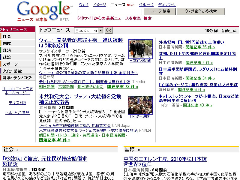 下の画像は日本でサービスを開始した当時の「Google ニュース」の画面です。