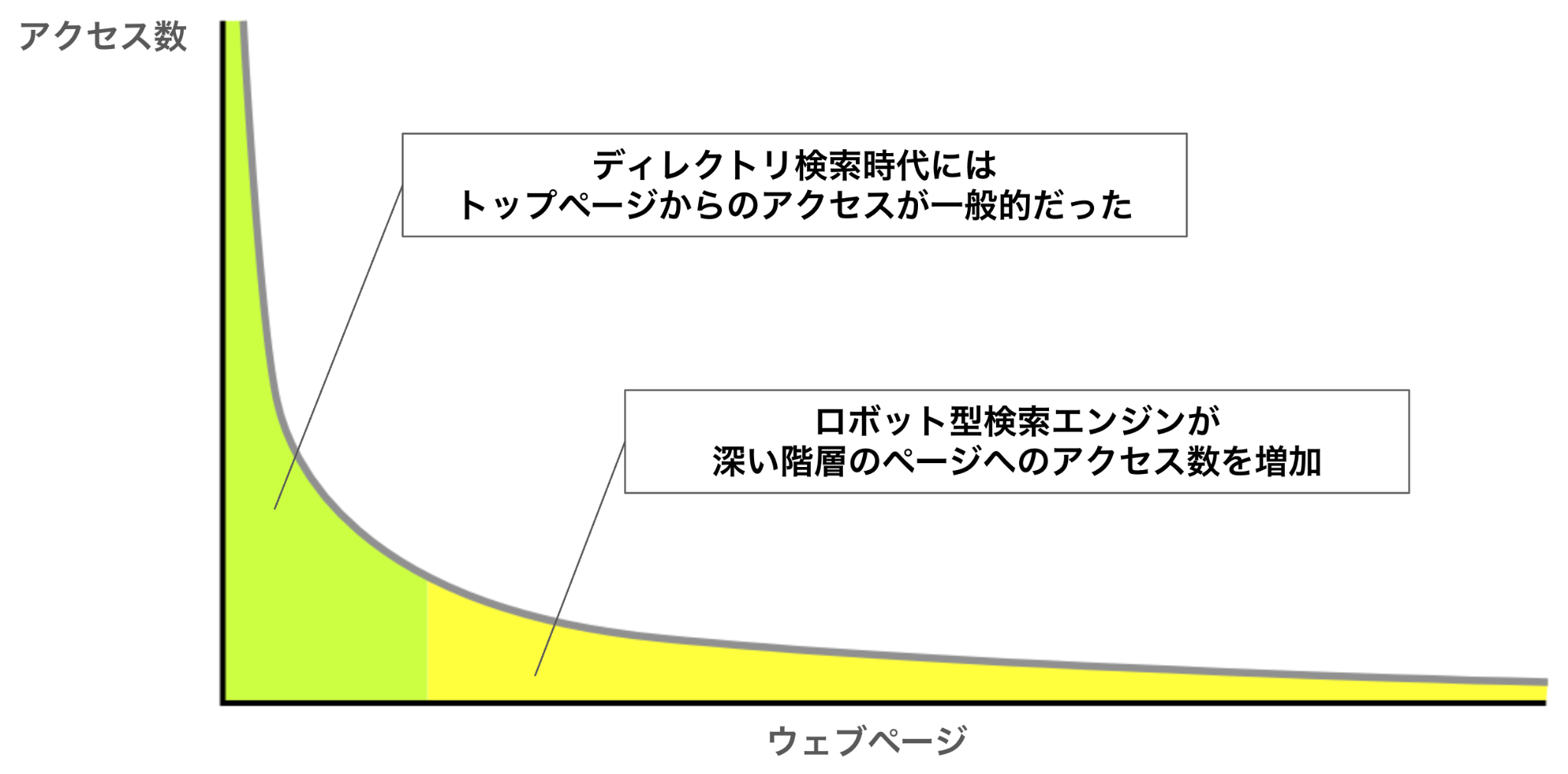 ところが、Googleのようなロボット型の検索エンジンが普及してくると「ディープリンク」のように、検索語句に関連がある深い階層のページに、ユーザーが直接アクセスできるようになります。これにより、トップページを経由せず検索語句と関連性の高い記事ページへ直接訪問する流れが主流になり、トラフィックの大部分を占めるようになっていきました。
