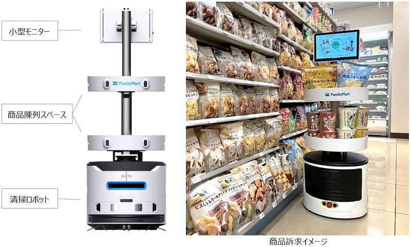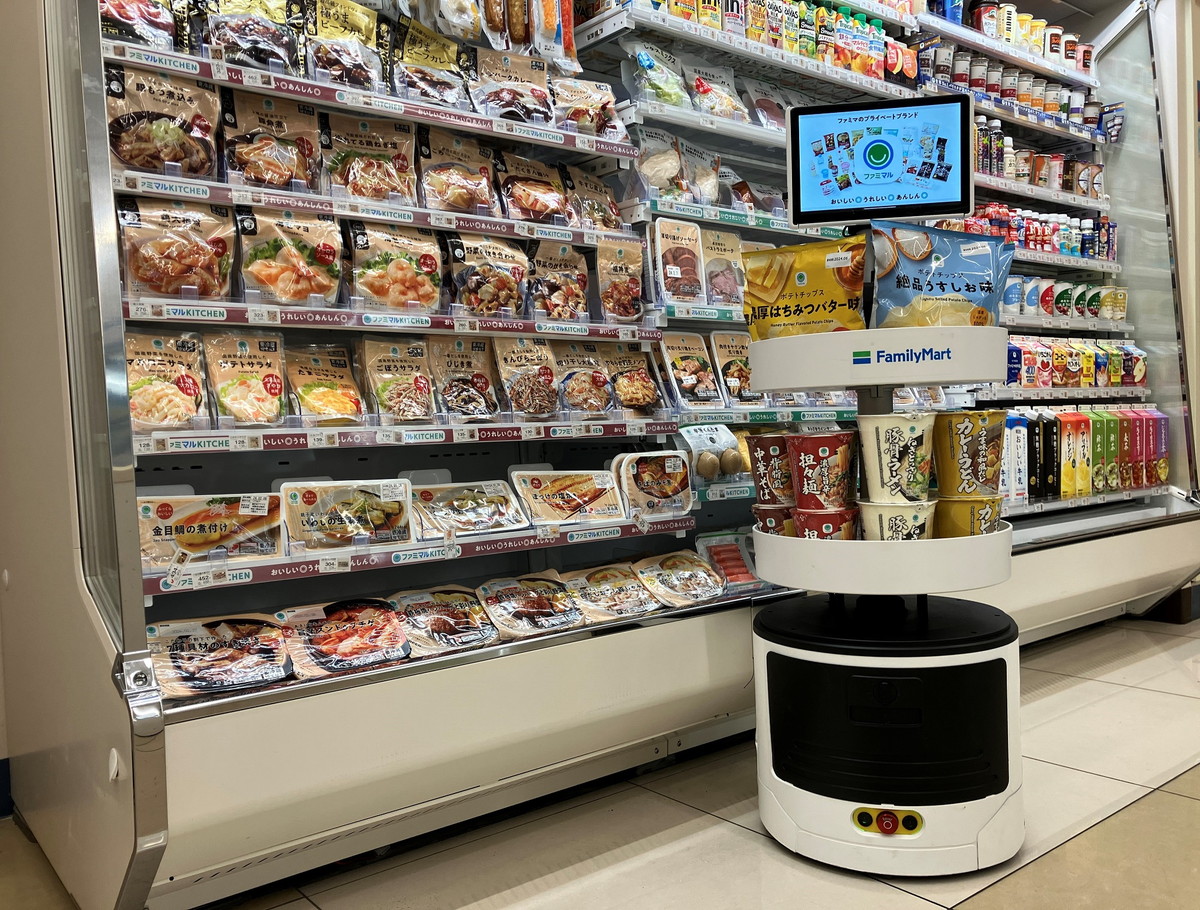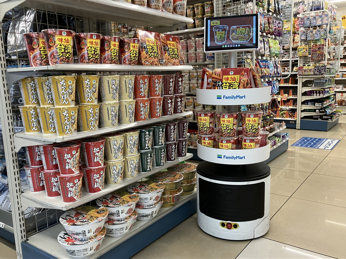 2023年12月に本格導入を開始した「多機能型ロボット」(名称:ポム)も、店舗運営の効率化や販促に一役買っている。アイウイズロボティクス社(品川区)とファミマが共同開発した同ロボットは、室内業務用小型清掃ロボットに、販促用の「陳列棚」と「タブレット」を拡張した、コンビニ向けのオリジナルモデルだ。