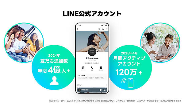 「Connect One構想」の中心であるLINE公式アカウントは、2024年の友だち追加数が年間4億人を超え、2025年4月の月間アクティブアカウントは120万を超えているという。
