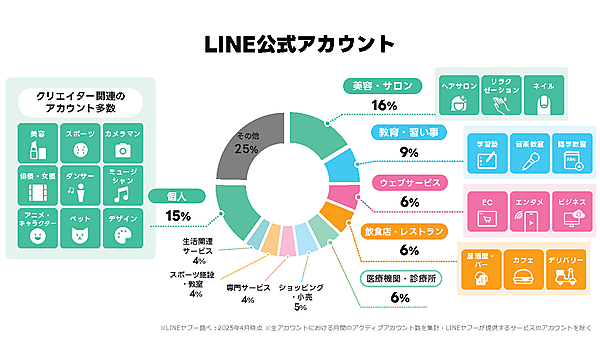 LINE公式アカウントを業種別に分類すると、美容・サロンが16%と最も多く、次いで個人のクリエイターが15%、教育・習い事が続いた。