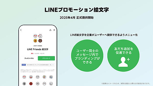 2025年4月には、新しいつながりを生むソリューションとして「LINEプロモーション絵文字」がリリースされた。これは、企業がオリジナルのLINE絵文字を、友だち追加を条件にユーザーに無料で配布できるサービスである。ユーザーは企業のLINE公式アカウントを友だち追加するだけで絵文字を無料で利用できるため、企業は友だち数の増加を期待できる。