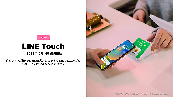 2025年10月以降には、「LINE Touch」という新サービスが提供される予定だ。これは、タッチするだけでLINE公式アカウントやLINEミニアプリに素早くアクセスできる機能である。たとえば、LINEミニアプリの起動を簡単に行えるほか、友だち追加、会員証の提示、モバイルオーダー、店頭特典、店内のマップ表示など、さまざまな用途で利用が可能になる。