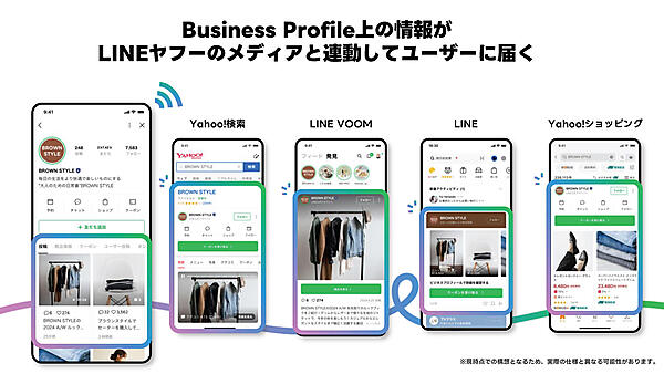 Business Profileでは、ブランド情報、店舗情報、LINE公式アカウントで発信している内容、予約、お問い合わせなどが集約できる。また、LINEヤフー上の各種法人サービスや自社ウェブサイトとも連携が可能となる。