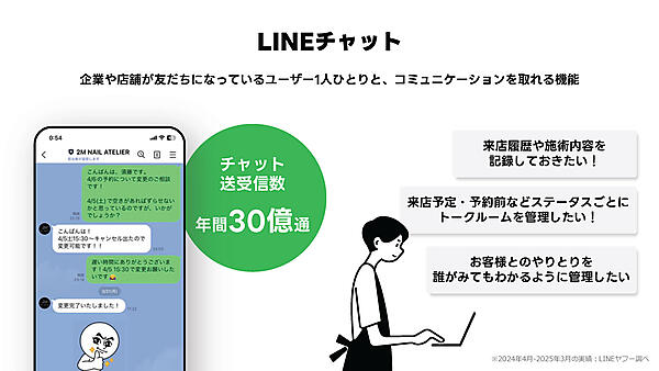 LINE公式アカウントとユーザーがチャットする機能である「LINEチャット」は、年間で30億通のトラフィックが発生している。利用者は年々増加しており、顧客カルテのような機能を追加し、従業員間の引き継ぎをスムーズにする新機能「チャットProオプション」が提供されている。