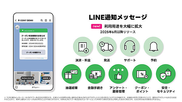 LINE通知メッセージでよく利用されているのは、宅配の通知メッセージや決済のお知らせなどであり、利用頻度が高まっている。友だち追加していなくてもユーザーにメッセージを届け、その通知から友だち追加を促すことも可能だ。そのほか、抽選結果のお知らせ、クーポンの締め切り連絡、金融手続きなどでも利用緩和が進む。2025年6月以降、利用用途が大幅に拡大される予定である。