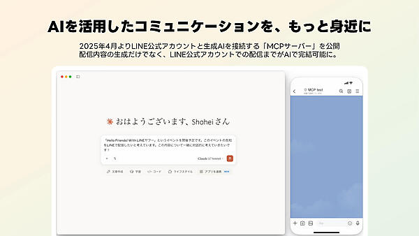 2025年4月からLINE公式アカウントと生成AIを接続する「MCPサーバー」が公開された。これにより、「Claude(クロード)」をはじめとしたさまざまな対話型AI上で、メッセージ作成のサポートや最適なテンプレートの選択、送信などが実現可能となっていく。