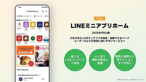 2025年9月以降にリリースされる予定の「LINEミニアプリホーム」は、LINEアプリ内にアプリストアがあるような構造で、LINEミニアプリを探しやすくする機能である。たとえば、過去に利用したLINEミニアプリや人気のLINEミニアプリが閲覧でき、カテゴリー別にLINEミニアプリが表示される。