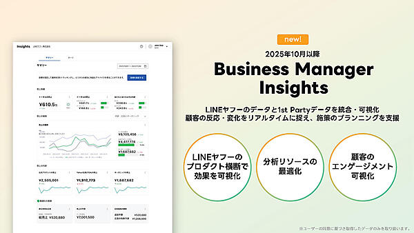 これはLINEとYahoo! JAPAN上のデータを可視化できるツールであり、LINE公式アカウントの友だちの特徴、友だち追加による売上貢献度、LINEやYahoo! JAPAN上の幅広いチャネルのプランニング法などを横断的に可視化・分析し、その先の広告配信に活用できる。