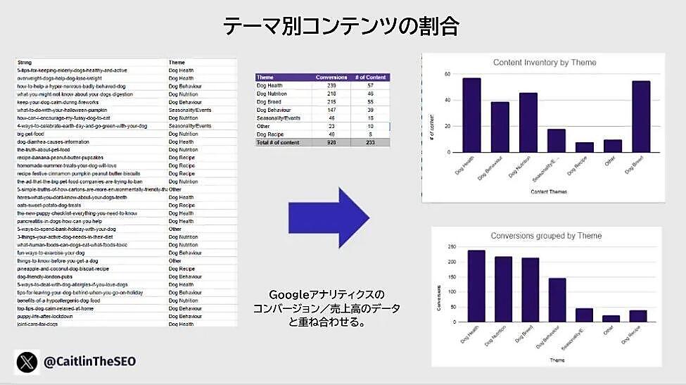 各競合ページは、「犬の健康」「犬用レシピ」「季節性/イベント」などのテーマに分類された。