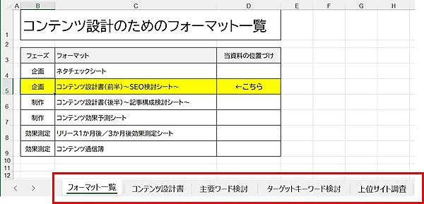 この6つの資料のうち、企画段階で最重要となるのが「コンテンツ設計書(前半)~SEO検討シート~」です。
