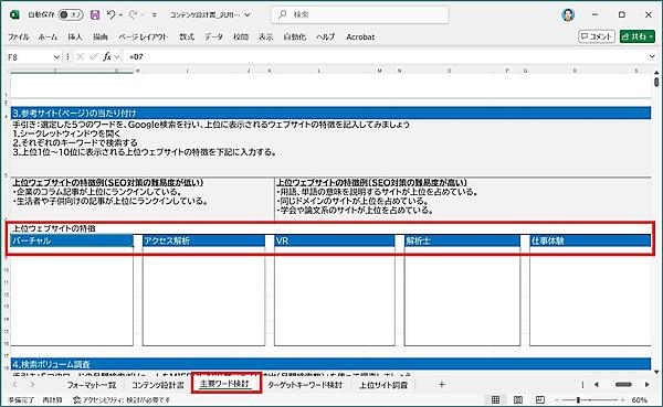 次に、赤枠で囲まれたシートをご確認ください。これから皆さんにご記入いただくのは、「コンテンツ設計書」「主要ワード検討」「ターゲットキーワード検討」「上位サイト調査」の各シートです。