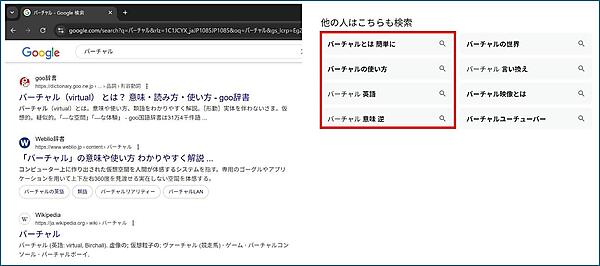 たとえば「バーチャル」というキーワードで検索すると、「バーチャルとは?」という問いに答えるような、言葉の意味を解説した辞書サイトやWikipediaなどが検索結果の上位に表示されます。