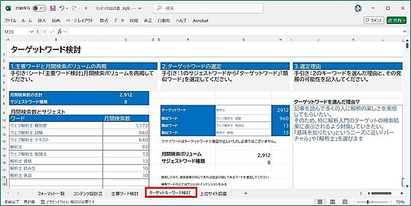 選んだキーワードは、次のシート「ターゲットキーワード検討」にメモしておきましょう。