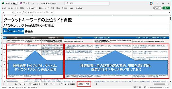 最後の仕上げとして、シート「上位サイト調査」に、実際にそのキーワードで検索した際に表示された上位サイトをメモしておきましょう。検索結果は時間や状況によって変化するため、調査時点での記録として残しておくことが重要です。