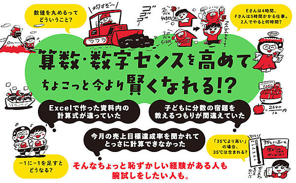 四則演算の基本から、分数の計算、方程式、文章題、割合、速度など、小さなステップでしっかり学べる! でも、ところどころでクスッとなる大人のための算数の教科書です!