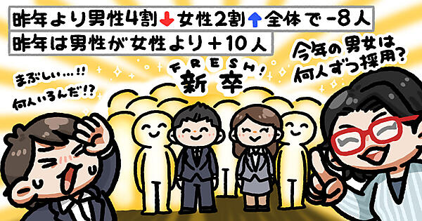 今年の新入社員は昨年の新入社員に比べて男性が40%減って、女性が20%増えて、全体では8人減った、昨年は男性が女性より10人多かったという話をしたら、「今年の採用数は、男性18人、女性24人」って当てられちゃったんです。