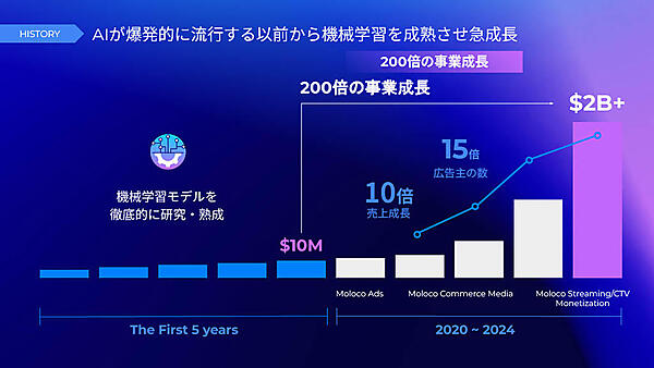 有木 Molocoはアプリ広告の会社と思われていますが、正しくは“機械学習の会社”です。創業者はGoogleの機械学習エンジニアで、2013年の設立から5年間を機械学習モデルの研究や作成に費やしてきました。学習モデルの完成後にサービスを開始し、2020年からの3年間で売上を10倍以上に伸ばすなど急成長を遂げています。