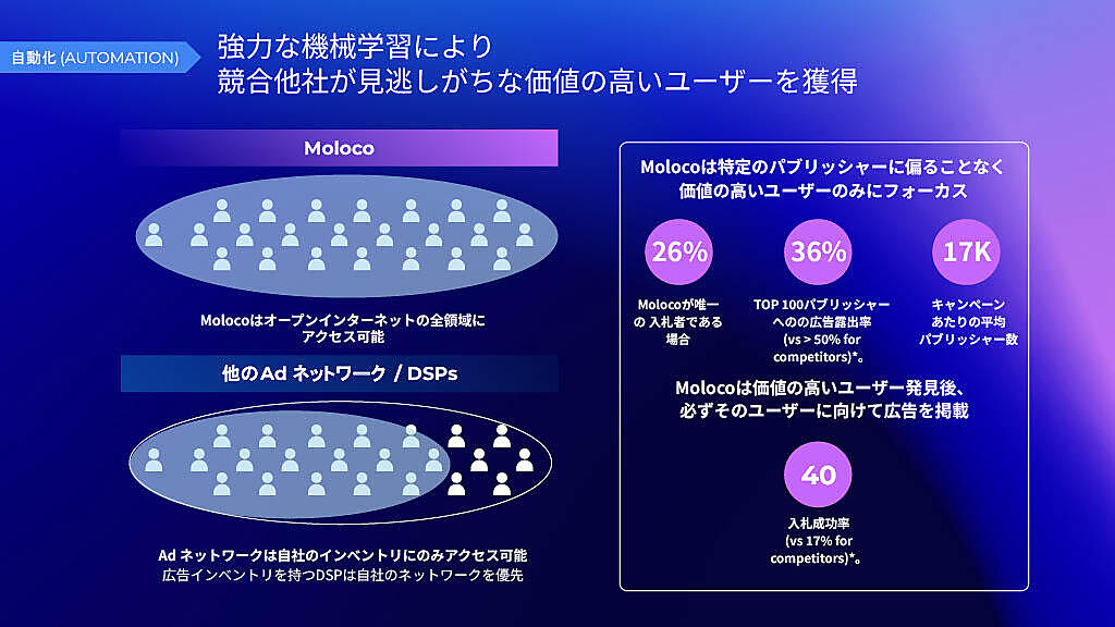 しかし、機械学習モデルが優れていれば、膨大なデータを高精度に解析し、質の高いユーザーに対してターゲティングしていくことができる。それができるのがMoloco Adsなんです。