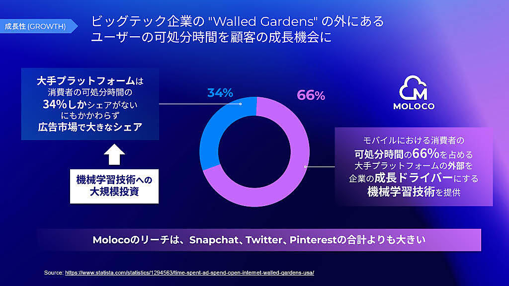 有木氏Molocoは、“機械学習の会社”です。GoogleやAmazon出身のエンジニアが作りこんだ機械学習システムにより、顧客のアプリの成長を加速させるサービスを提供します。