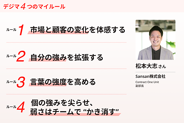 契約DXサービス『Contract One(コントラクトワン)』を率いる松本氏は「個人の強みを拡張し、弱さはチームでかき消す」ことを大事にしている。変化の激しい事業フェーズにおいて、個人とチームを進化させるマネジメント論や、マイルールについて聞いた。