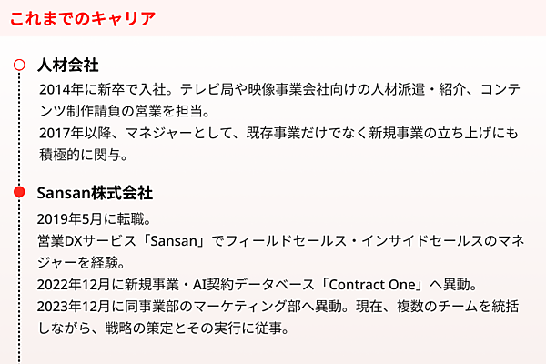 松本氏はSansanに入社後、営業DXサービス「Sansan」のフィールドセールス、そしてその経験を活かしインサイドセールスのマネジャーを経験。その後、Contract Oneのフィールドセールス兼インサイドセールスのマネジャーとして異動し、後にマーケティング部のシニアマネジャーを務めた。そして2025年6月には事業部の副部長に就任し、現在は営業とマーケティング双方の知見を活かして事業を牽引している