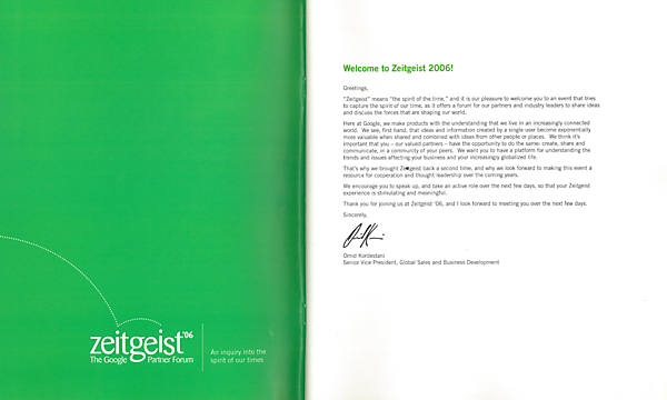 「ザイトガイスト」は(Zeitgeist:ある時代を特徴づける思想や気分を意味する言葉で、日本語では「時代精神」と訳される。元々はドイツ語)、世界中のCレベルのエグゼクティブ、起業家、科学者、アーティスト、政治家、スポーツ界のアイコンなど、各分野のトップリーダーや有識者が参加する招待制のカンファレンスで、当時のGoogleが考えていること、取り組んでいることを伝える場でした。