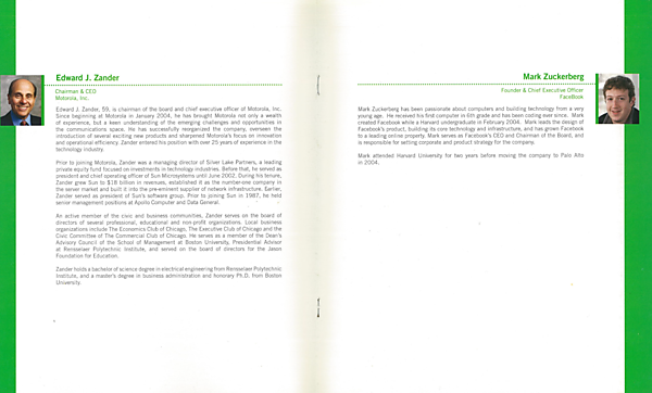 杓谷: マーク・ザッカーバーグが映っているページの左側に、モトローラのCEO エドワード・ザンガーが映っていますね。この5年後、2011年にGoogleはモトローラを買収しています。主にスマートフォン関連の特許取得が理由だと言われています。Googleとモトローラは、この頃からAndroid搭載スマートフォンの開発に取り組んでいたのだと思います。