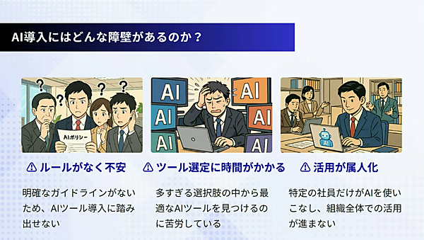 しかしながら、企業がAIを導入する際には、いくつかの障壁を乗り越える必要がある。1つめの障壁は、明確なガイドラインが整備されていないために、積極的な活用に繋がらず、不安感が生まれてしまうことだ。そして、2万種類以上のAIツールの中から自社に最適なツールを選べないでいること、属人的なAI活用によって全社への普及が遅れてしまうことなども大きな問題となっている。