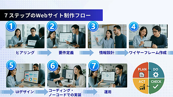 Webサイト制作のフローは、①ヒアリング ②要件定義 ③情報設計 そして、設計した情報を基に、ページのレイアウトやナビゲーションを視覚化する④ワイヤーフレーム作成 ⑤UIデザインと続く。近年では、ノーコードツールを活用したデザインが増えており、⑥コーディング・実装では開発スピードが向上している。サイトを公開して⑦運用開始となり、パフォーマンスの監視やユーザー対応を行いつつ、PDCAサイクル(改善・最適化)で次につないでいく。