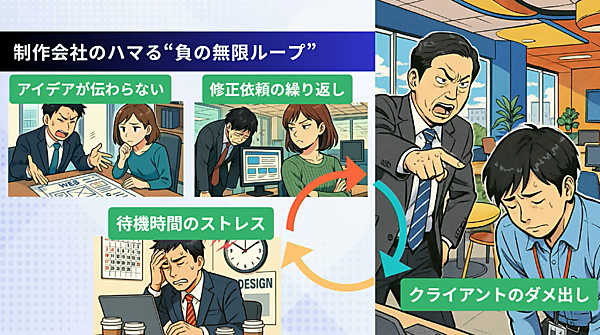 この中でAIが入る「引き算」によって、最も効率化ができるのはどの部分なのか。長澤氏が指摘するのは、Webディレクターなら一度は経験したであろう、情報設計からデザインプロセスにおいて陥りがちな「負の無限ループ」だ。デザイナーにアイデアがなかなか伝わらない、修正を繰り返してデザイナーを怒らせる、クライアントにダメ出しを食らうーーなどが繰り返され、時間と費用の追加コストが嵩み、外注ならさらに損失額は拡大する。