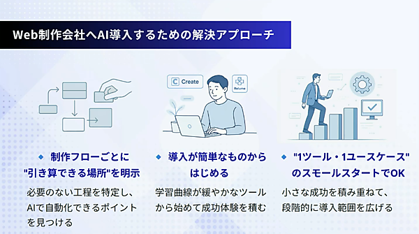 「AIを使えば楽になると言われたが、実際どう導入すべきかイメージが湧かない」「実務未経験者にAIの何から教育すればいいのかわからない」など、AIにまつわる悩みは多い。その一方で、AIが普及すればWeb制作の仕事はなくなるのではないかと懸念する人もいるだろう。