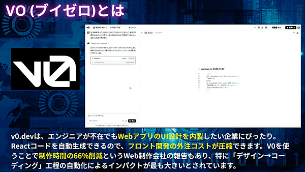 エンジニア不在でも、WebアプリのUI設計を内製化したい企業に最適なツール。Reactを活用した自動設計機能により、フロント開発の外注コストを大幅に削減可能。デザインからコーディングまでのプロセスを自動化し、「ボタンだけデザイン」などパーツ単位でのデザイン作成も可能。日本の制作会社でも導入が進んでおり、制作時間の66%を削減したというデータもあるという。