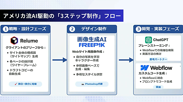「3ステップ制作」の一例として、長澤氏は、①戦略・設計フェーズで「Relume」 ②デザイン制作で画像作成AIの「Freepik(ロゴは大文字でiが!表記)」 ③開発・実装フェーズで「ChatGPT」「Webflow」が使われていることを紹介。このフローによって、かつて3カ月ほどかかっていたものが5営業日で納品できたという事例もあるという。