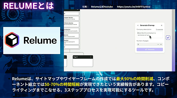 Relumeは、クライアントの要望を文章で入力するだけで、サイト全体のサイトマップ、構成図、各ページのレイアウト、コピーテキストまで全て作成する。また、サイトのURLを入力するだけでコピーすることもできる。