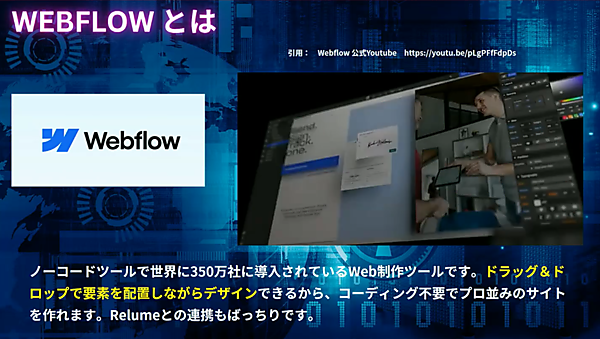 Webflowは世界350万ユーザーに導入されているノーコードWeb制作ツールであり、ドラッグ&ドロップで要素を配置するだけでデザインできるため、コーディング不要でプロ並みのサイトが作れる。Relumeとの連携も可能だ。
