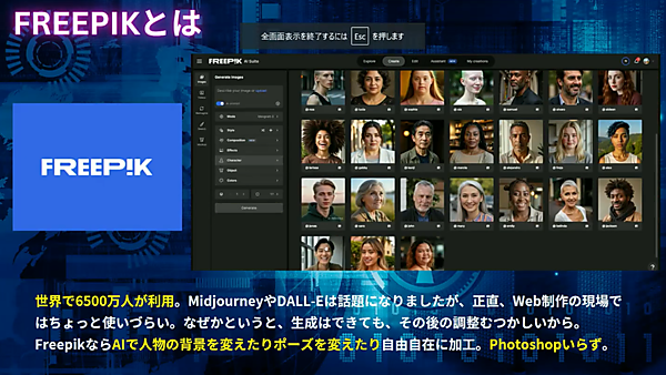 チャートやビジュアルについては、Freepikを使うとよい。AIによるビジュアル自動生成ツールで世界6,500万ユーザー(一説には1.5億ユーザー)が使っているが、日本での導入例は少ないという。かつて話題になったMidjourneyやDALL-Eは、画像生成ができても、その後Photoshopなどで調整する必要があった。その点、Freepikは背景を変えたりポーズを変えたり、自由自在に加工ができたりするため、Photoshopが不要。たとえば、社長の写真を5枚ほどアップロードするだけで、さまざまなシチュエーションでの動画や写真を生成することも可能だ。