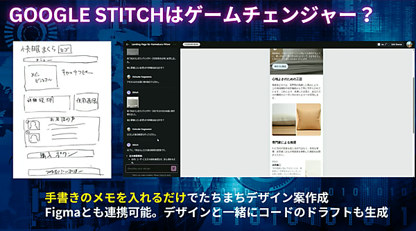 長澤氏は「AI時代に求められるWebクリエイターとは、足し算よりも引き算ができる人材」と語り、それがますます加速していることを強調した。その象徴となる1つが、「Google I/O 2025」で発表されたGoogleのAI戦略だ。AIの「日常化」「どこでも化」「全産業浸透」を宣言しており、その一環として、Web制作ツール「Google Stitch(グーグル スティッチ)」が登場している。まさにWeb制作の“引き算”をすべて達成しようとするツールであり、手書きのワイヤーフレーム的なメモを読み込ませるだけで、たちまちデザインを作成しコードのドラフトまで生成してくれるというものだ。現在メジャーな存在であるFigmaとも連携でき、ゲームチェンジャーとしての野心がうかがえる。