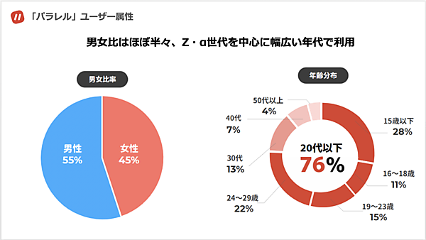 ユーザーはZ・α世代が大半を占め、中学生から30代までまんべんなく使用されている。男女比率もほぼ半々(男性55%、女性45%)だ。