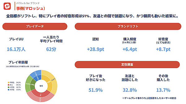 2025年2月25日~ 3月17日の約3週間実施したところ、「認知」が28.9ポイント、「好意度」が8.7ポイント増加したほか、定性調査では「プレイ後好きになった」51.9%、「その後購入した」13.7%などブランドリフトへの貢献が明らかになった。