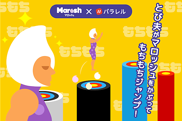 同コラボでは、パラレルの人気ミニゲーム「とび夫」をマロッシュ仕様に着せ替え。背景やキャラクターの風貌を変更したほか、高得点を獲得したタイミングでマロッシュのロゴやカタチをしたエフェクトが出るようにした。「マロッシュチャレンジ」と銘打ち、アプリ内の目立つ場所にバナーを配置したほか、高得点者への賞品やSNSシェアによるプレゼントキャンペーンも用意した。