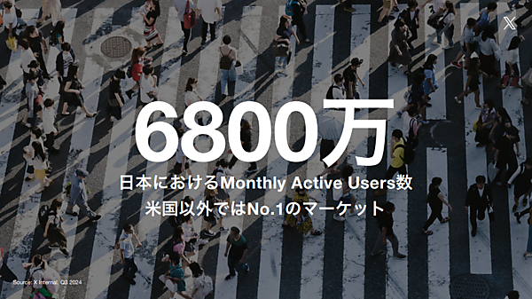 日本におけるXのマンスリーアクティブユーザー数は6,800万人、デイリーアクティブユーザーは4,000万人に達しており、日本は米国に次ぐ最大の市場となっている。